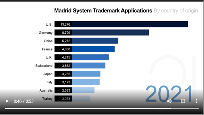 2021 年,美國申請人提交的國際商標申請數(shù)量最多(總計13,276 件),同比2020年增長 32.5%。